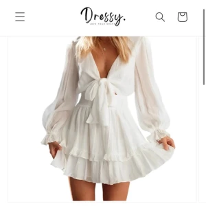 Säljer min super fina Dressy klänning. Nypris 599kr. Söt vit kortklänning med långa puffärmar, smock i midjan och volangdetaljer vid fållen och ärmsluten. Klänningen har en stor knytrosett framtill och är tillverkad i ett lätt, luftigt tyg som passar perfekt till sommaren. Perfekt för studenten och sommaren