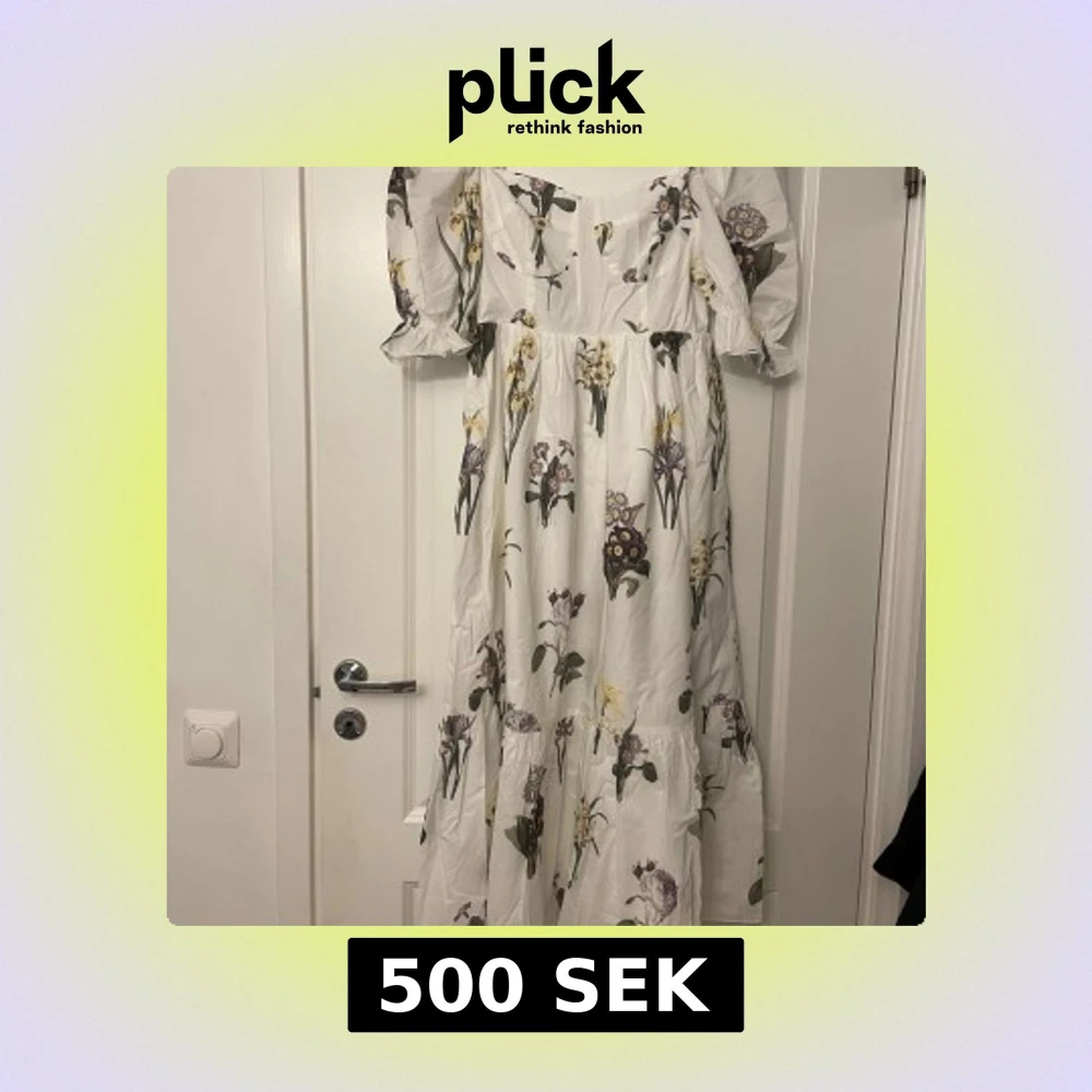 Blommig långklänning med puffärm - Säljer en  långklänning med blommig mönster på vit botten. Klänningen har puffiga kortärmar och en rynkad detalj längs sidan som ger en cool siluett. Från Lindex. Aldrog använt.