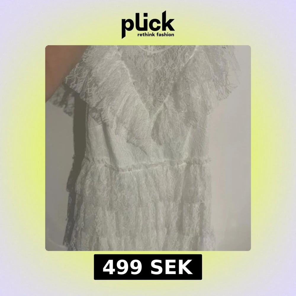 Superfin vit klänning i spets med volangdetaljer och pärlknappar i ryggen. Klänningen har kort ärm och flera lager spets som ger en romantisk känsla. Perfekt för sommarens alla tillfällen!