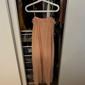 Lång klänning i aprikos färg, storlek xs men stor i storlek.