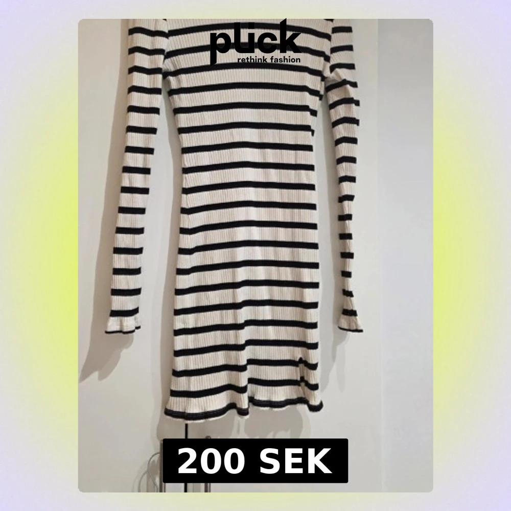 Säljer en långärmad, ribbad klänning med svarta horisontella ränder på vit botten. Klänningen har en kroppsnära passform och lätt utsvängd nederkant. Perfekt för dig som gillar en enkel men stilren look.