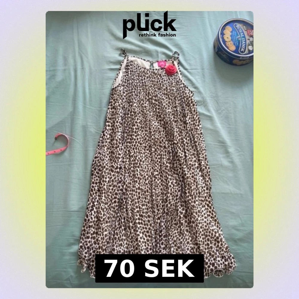 Snygg ärmlös klänning med leopardmönster i brunt och vitt. Klänningen har smala axelband och en lös, luftig passform som passar perfekt för varma dagar. Dekorerad med en rosa blomdetalj vid axelbandet för en extra touch.