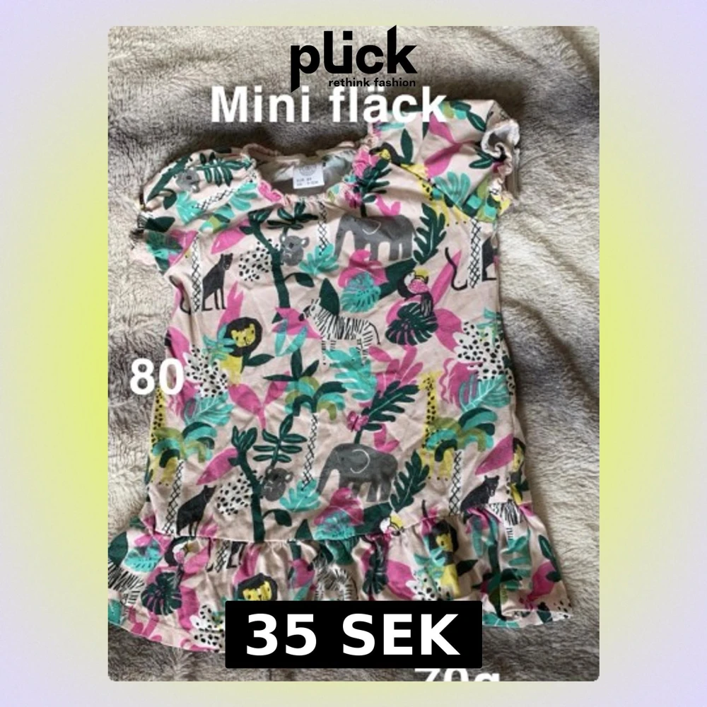 Supersöt kortklänning från Lindex med färgglatt djurmönster i rosa, turkos, gul och svart. Klänningen har volang nertill och korta ärmar. Perfekt för dig som gillar lekfulla prints. Mini fläck. Storlek 80