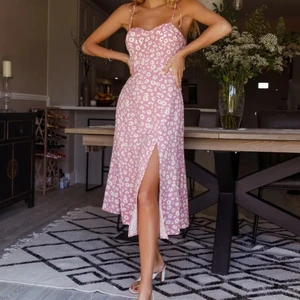 Blommig klänning med slits och knytband. Storlek M/38 Aldrig använd. Original förpackning finns. Dragkedja i sidan