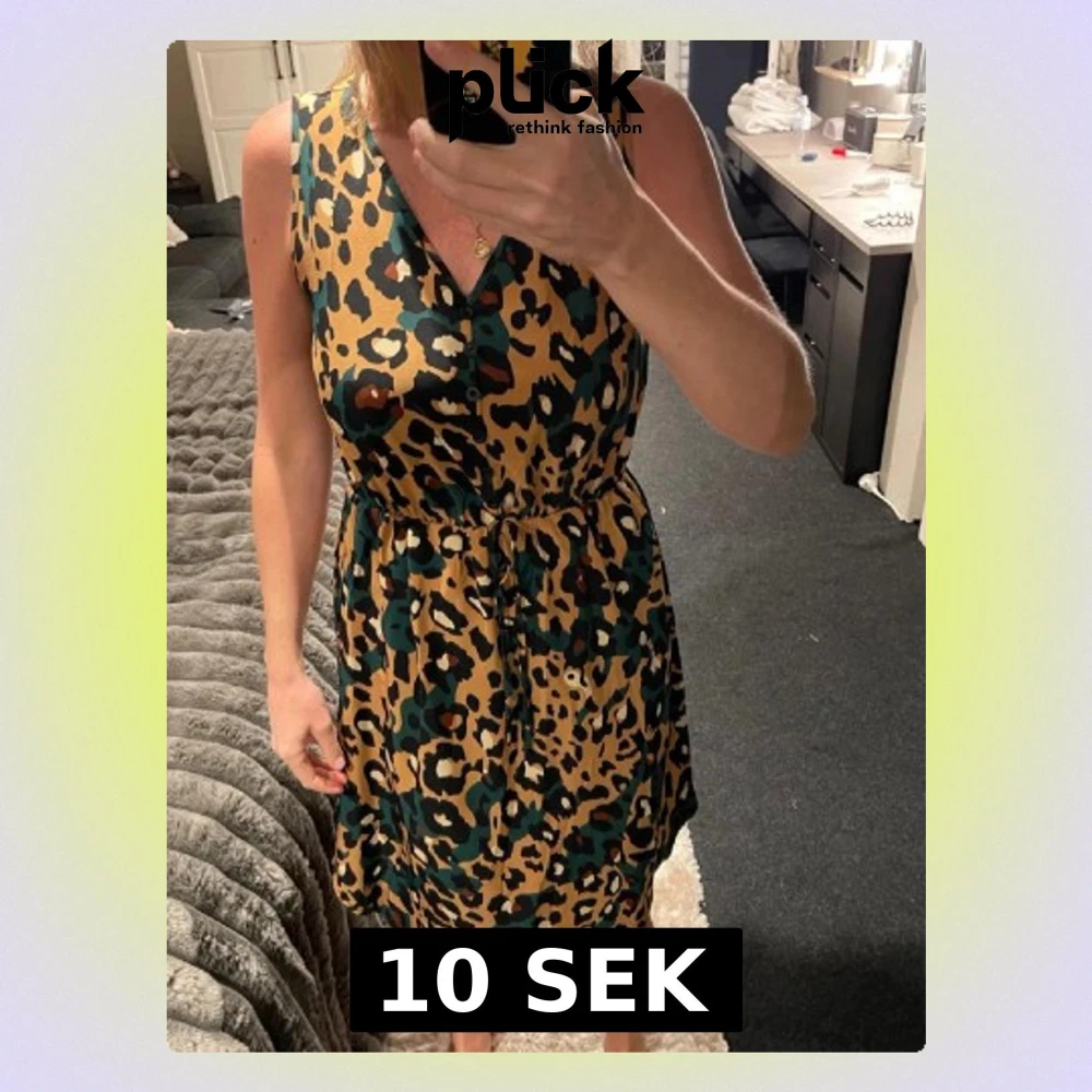 Säljer en cool leopardmönstrad klänning i beige, svart och grönt. Klänningen är ärmlös, har v-ringad hals och knappar framtill. Midjan kan justeras med snörning för en snygg passform. Perfekt för dig som gillar djurmönster och vill sticka ut.