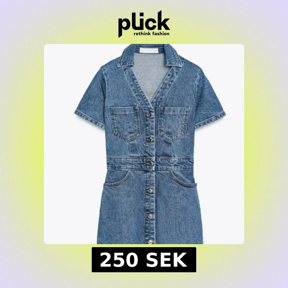 Säljer en kort jeansklänning i klassisk blå denim med korta ärmar och v-ringad krage. Klänningen har framfickor på bröstet och höften samt snygga metallknappar hela vägen framtill.