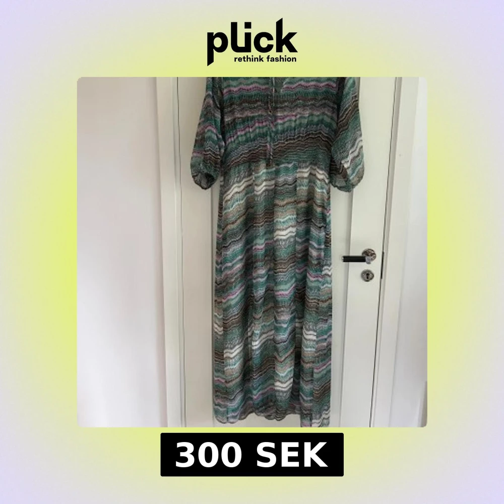 Säljer en långklänning från Line of Oslo med vågigt mönster i grönt, brunt, vitt och lila. Klänningen har trekvartsärmar, v-ringning med knyt och luftig passform. Fastsydd underkjol. Perfekt för dig som gillar bohemisk stil och färgkombinationer.