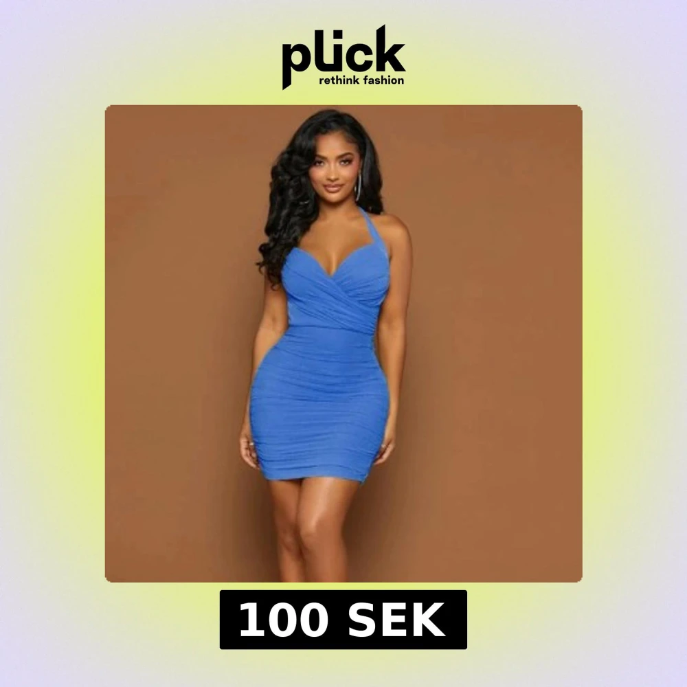 Snygg blå kortklänning med halterneck och omlott-design. Klänningen har en tight passform som framhäver figuren och en v-ringad urringning. Perfekt för en utekväll eller fest!
