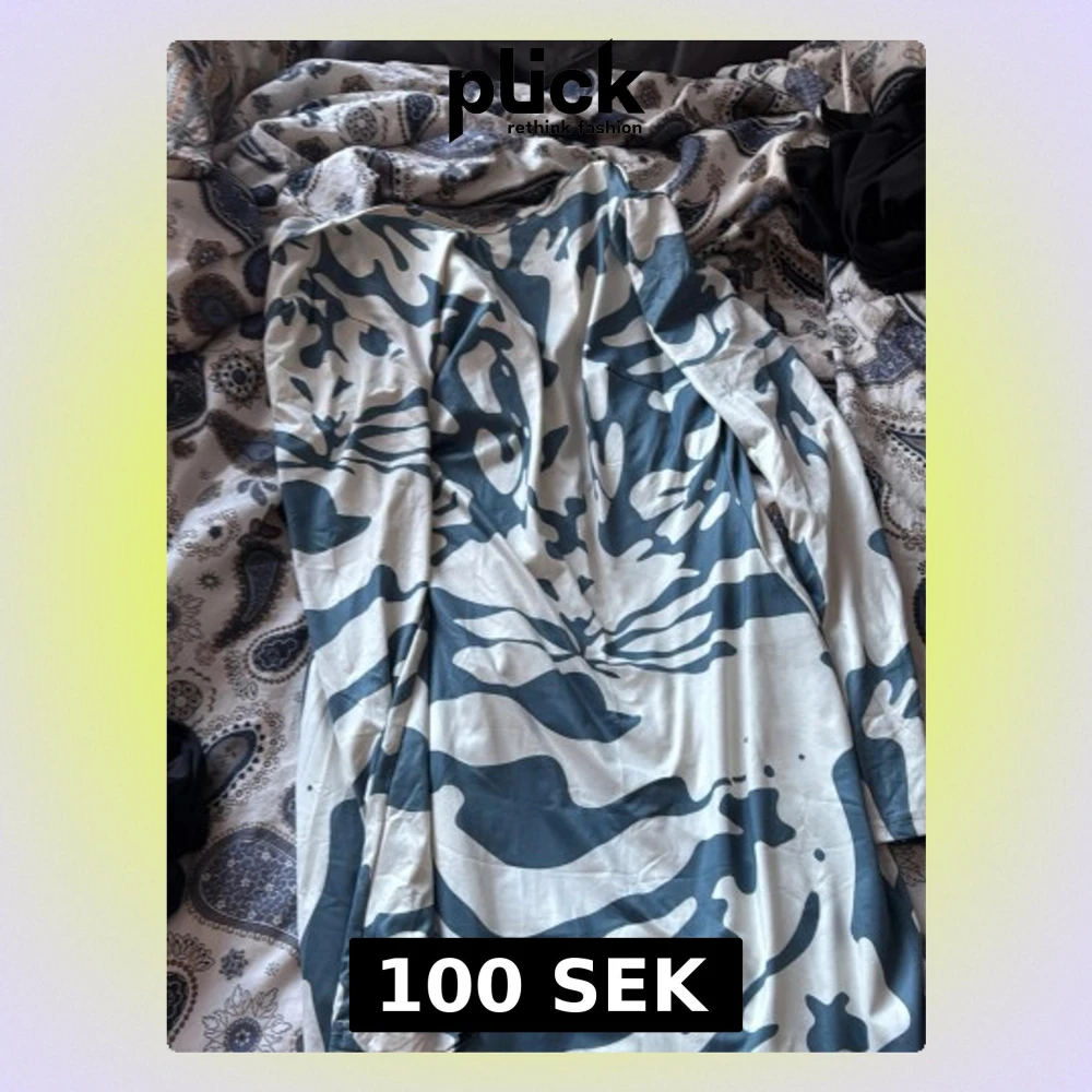 Säljer en långärmad klänning med vit bas och blått kamouflagemönster. Klänningen har v-ringning och är i ett mjukt, stretchigt material som känns bekvämt mot huden. Perfekt för dig som gillar unika mönster och vill sticka ut.