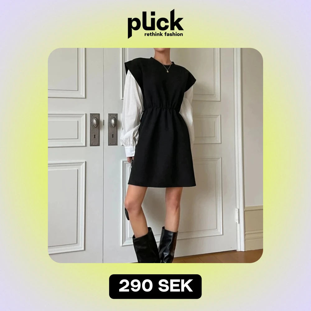 Snygg svart kortklänning med vita långa ärmar. Klänningen har en elastisk midja som ger en fin passform och en stilren look. Perfekt för både vardag och festliga tillfällen. Kombinera med stövlar för en komplett outfit!