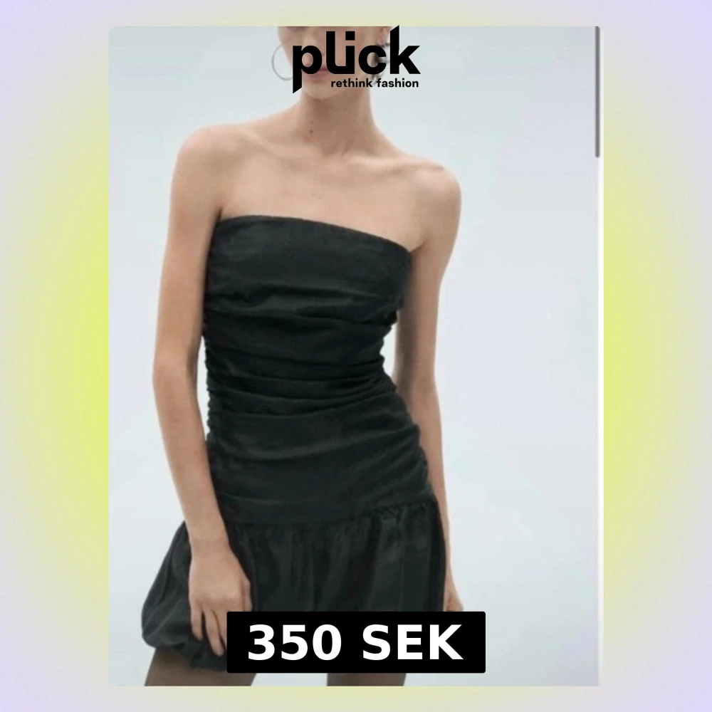 Säljer en svart axelbandslös kort klänning med rynkade detaljer och volang nedtill. Klänningen har en tight passform upptill och är tillverkad i ett glansigt material som ger en elegant look. Perfekt för dig som vill ha en stilren och trendig outfit.