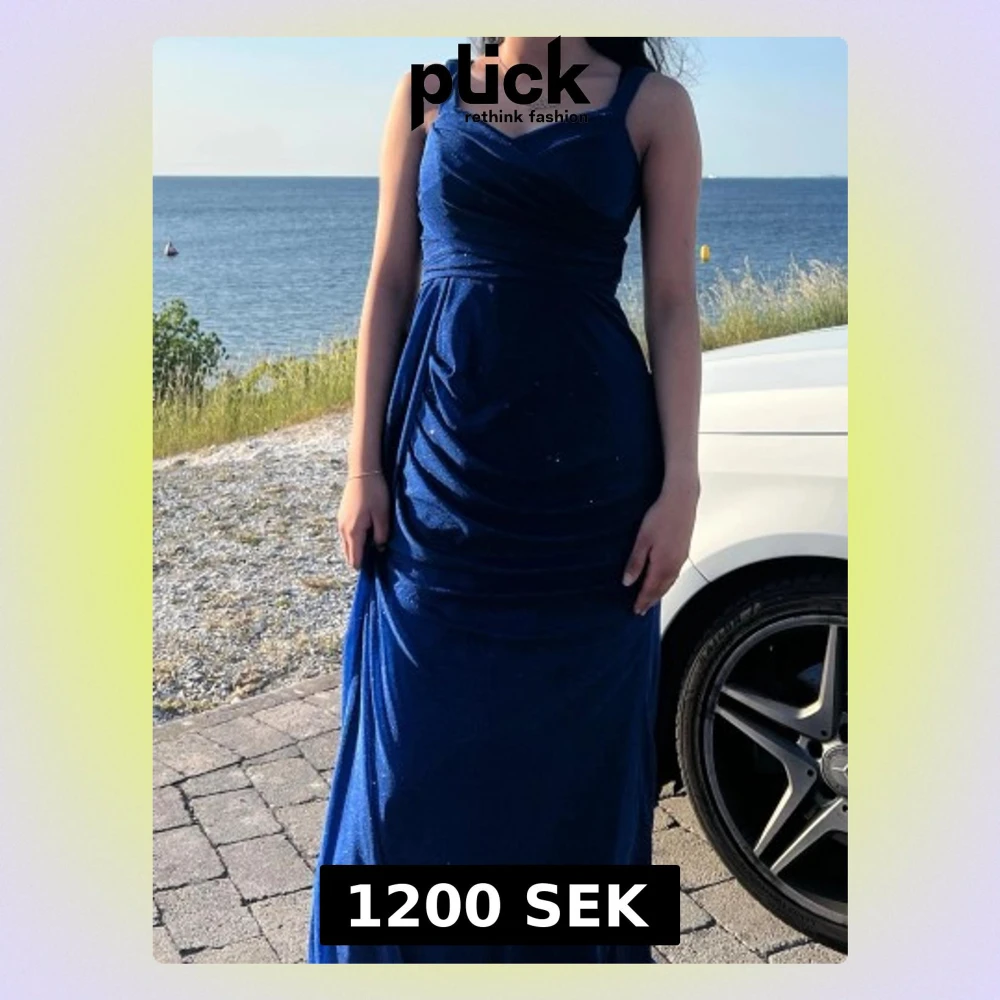 Marinblå glittrig långklänning - Säljer en marinblå långklänning med glittrigt tyg och smala axelband. Klänningen har en snygg offshoulder-detalj upptill och en elegant, figurnära passform som faller snyggt längs kroppen. Perfekt för dig som vill sticka ut med en stilren look.