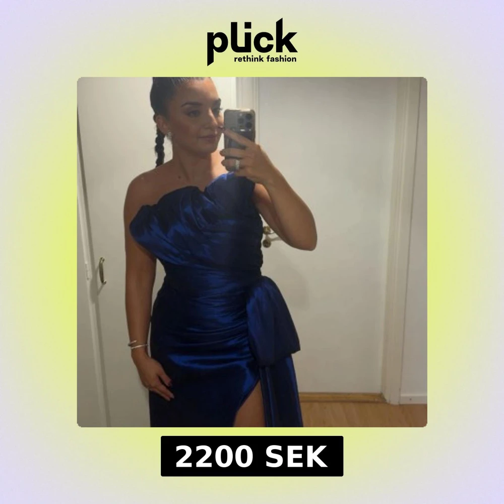 Säljer en marinblå långklänning i glansigt satinliknande material. Klänningen är axelbandslös med draperad överdel och markerad midja, samt en snygg slits framtill. Perfekt för bal eller fest och ger en riktigt elegant look.