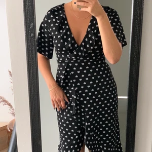 Svart klänning i skönt stretchigt material med vita hjärtan på. Omlott-urringning och omlott på framsida vid benen🖤🤍