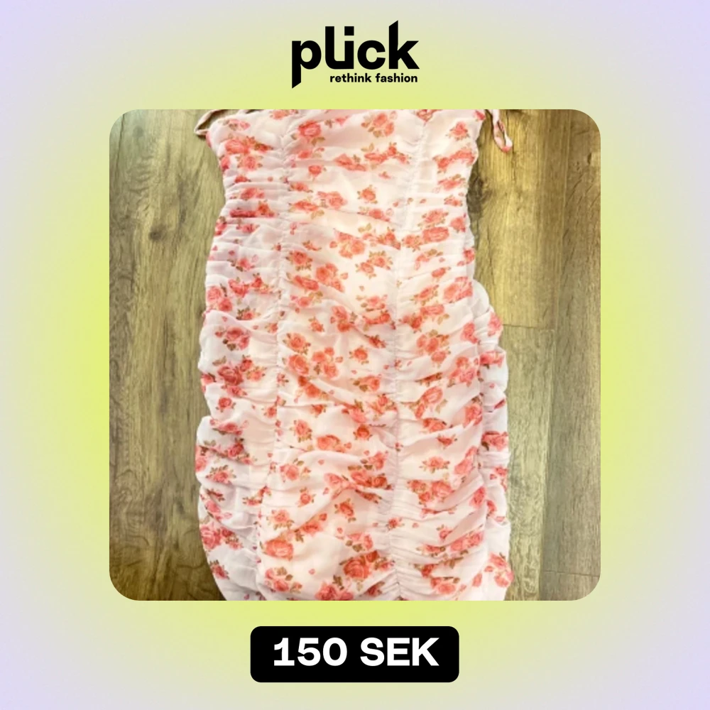 Kort rosa blommig klänning med snören som man knyter vid axeln med och dragkedja för att stänga klänningen. Klänningen har använts 1 gång tidigare.