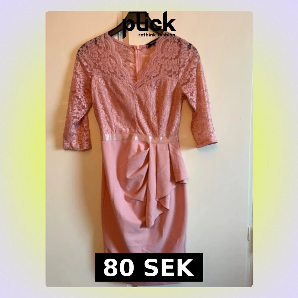 Söt rosa klänning med spets upptill och trekvartsärmar. Kjolen har en snygg volangdetalj framtill och markerad midja med satinband. Klänningen har dragkedja i ryggen och är figurnära i modellen. Har bara använt den en gång. Så riktigt nyskick!