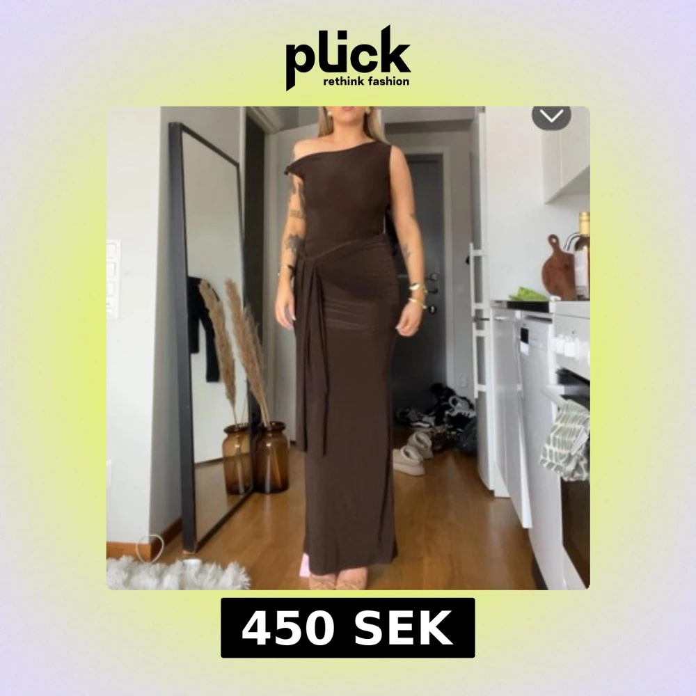 Säljer en elegant brun långklänning med oneshoulder-design och knyt i midjan. Klänningen har en figurnära passform och stilren siluett, helt ny med lapp kvar