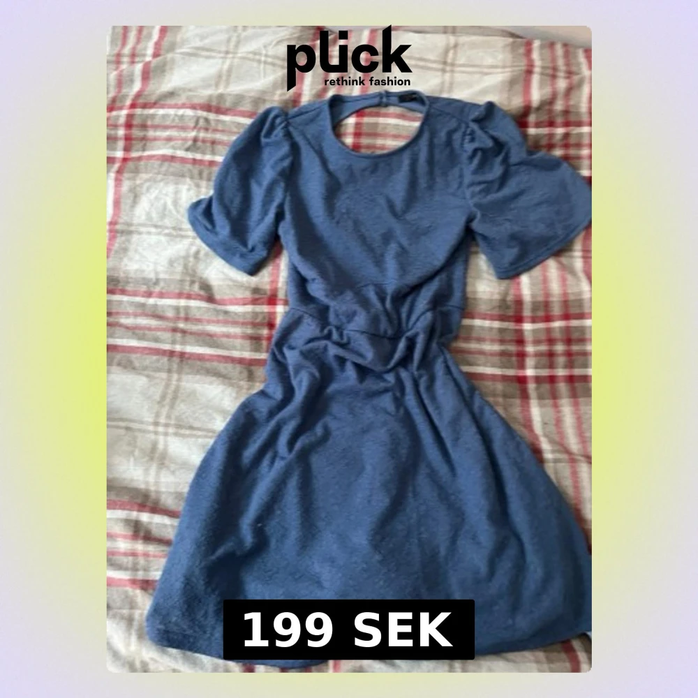 Söt blå klänning med rund halsringning. Klänningen har en öppen detalj i ryggen och är sydd i ett mjukt tyg med lätt struktur. Kjolen är utsvängd och modellen är kort. 💕💕