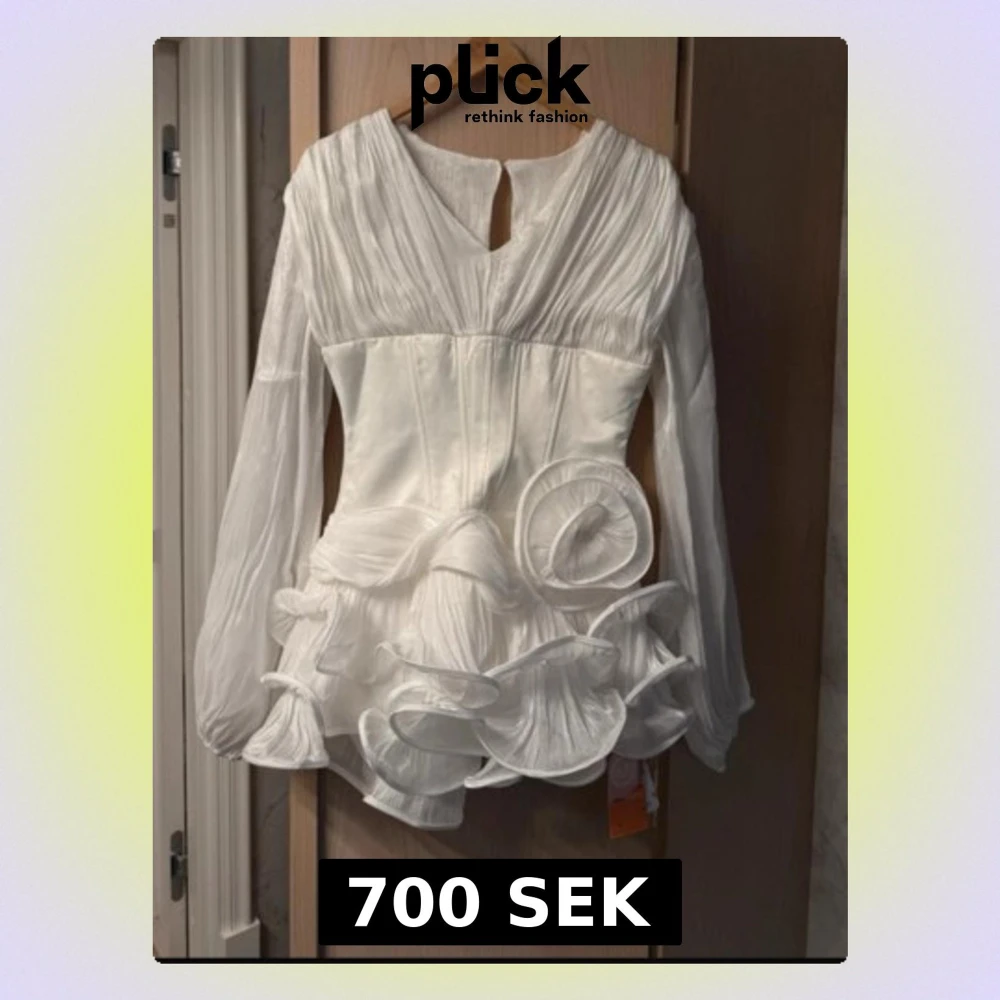 Supersnygg vit kortklänning med transparenta långärmar, markerad midja och stora volangdetaljer samt en dekorativ rosett framtill. Klänningen har en unik struktur och ger en riktigt statement-look. Perfekt för dig som vill sticka ut! Perfekt till studenten