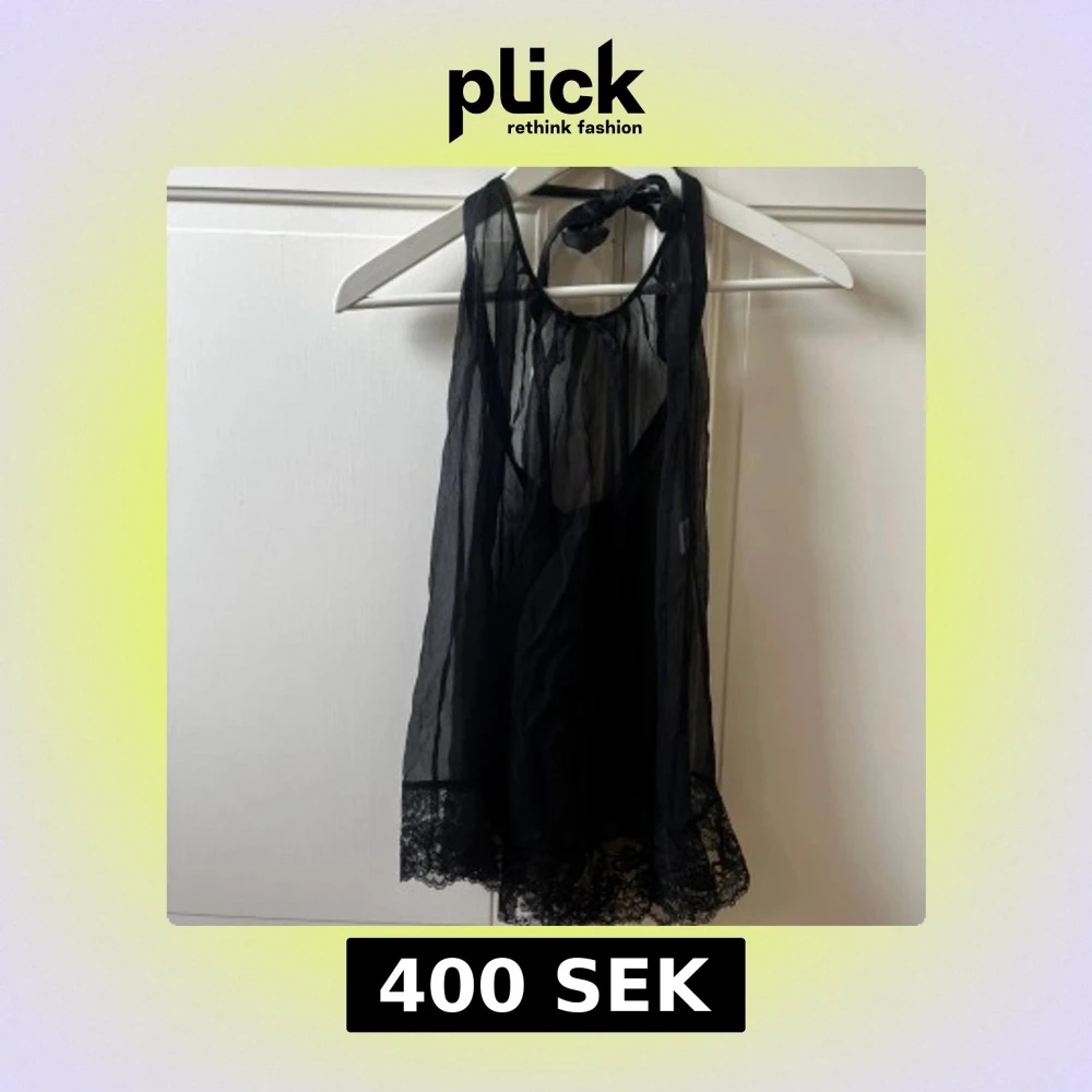 Säljer en svart, transparent nattlinne med knyt i nacken och vacker spetskant längst ner. Toppen är tunn och luftig med en lätt glansig finish, perfekt för att skapa en cool layering-look. Spetsdetaljen ger en extra touch av stil och edge. i 95% silkes