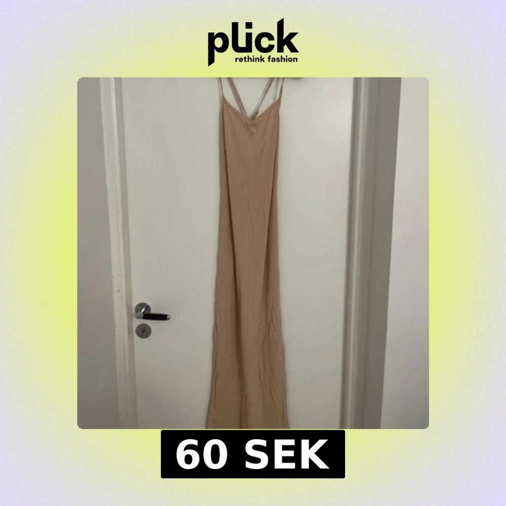 Säljer en stilren beige långklänning med smala axelband som korsas i ryggen. Klänningen har en rak passform och är tillverkad i ett mjukt, lätt material som ger en avslappnad look. Perfekt för varma dagar eller sommarens tillställningar.
