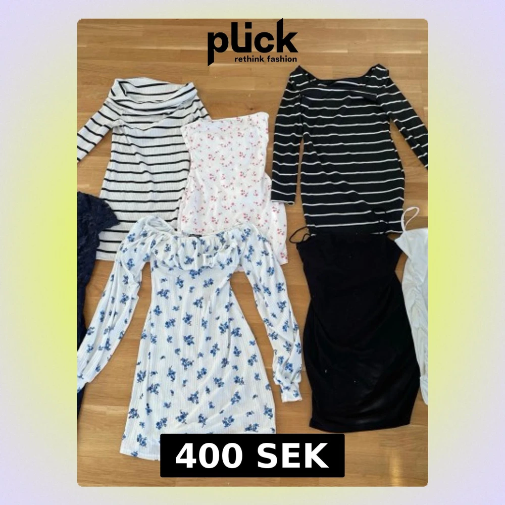 Paket med 7 klänningar i olika färger och mönster. Inkluderar en marinblå spetsklänning, en vit klänning med blå blommor och långa ärmar, en vit klänning med röda blommor, en svart ribbad klänning, samt två randiga klänningar i svart och vitt. Perfekt för dig som vill variera din stil.