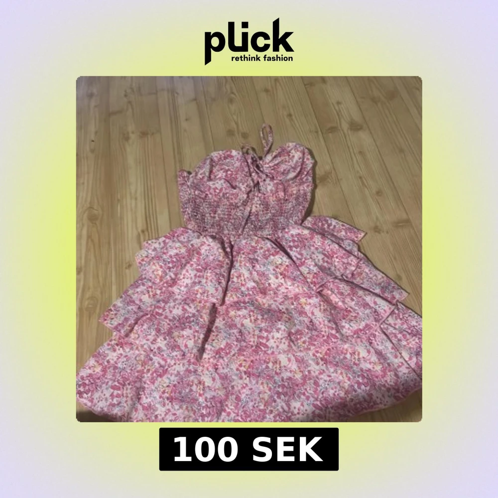Söt axelbandslös klänning i rosa och vita toner med blommigt mönster och volangdetaljer. Smockad överdel och knytband upptill. Perfekt för sommarens varma dagar.