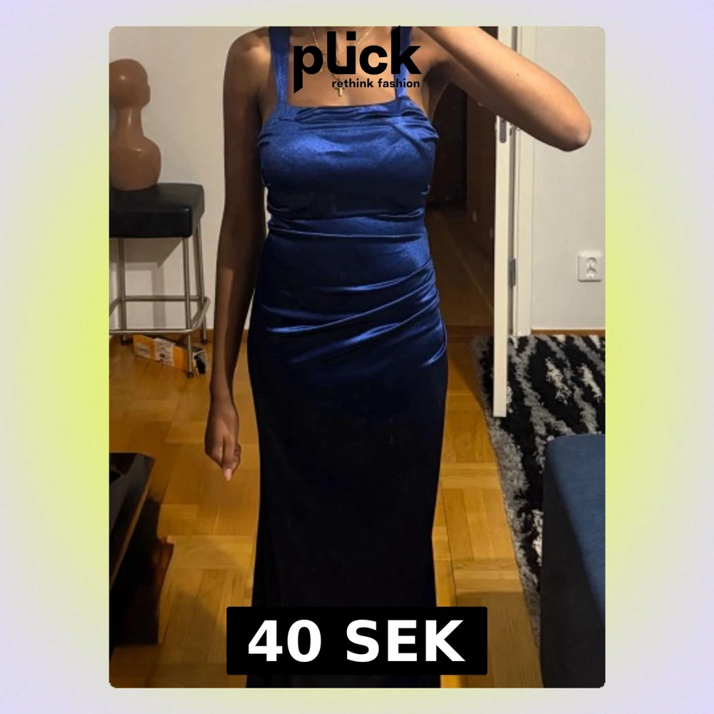 Säljer en elegant marinblå långklänning i glansigt satinmaterial. Klänningen har breda axelband, figurnära passform och snörning i ryggen för en snygg siluett. Perfekt för dig som vill sticka ut med en stilren look.
