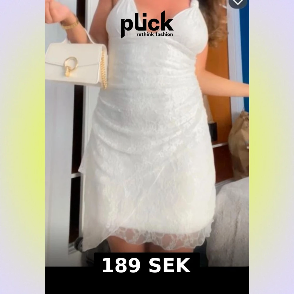 Supersöt vit kort klänning med spetsdetaljer och omlottkänsla. Halterneck med knyt i nacken och v-ringad urringning. Klänningen har ett tunt, lätt tyg och sitter figurnära. Perfekt för sommarens alla tillfällen!
