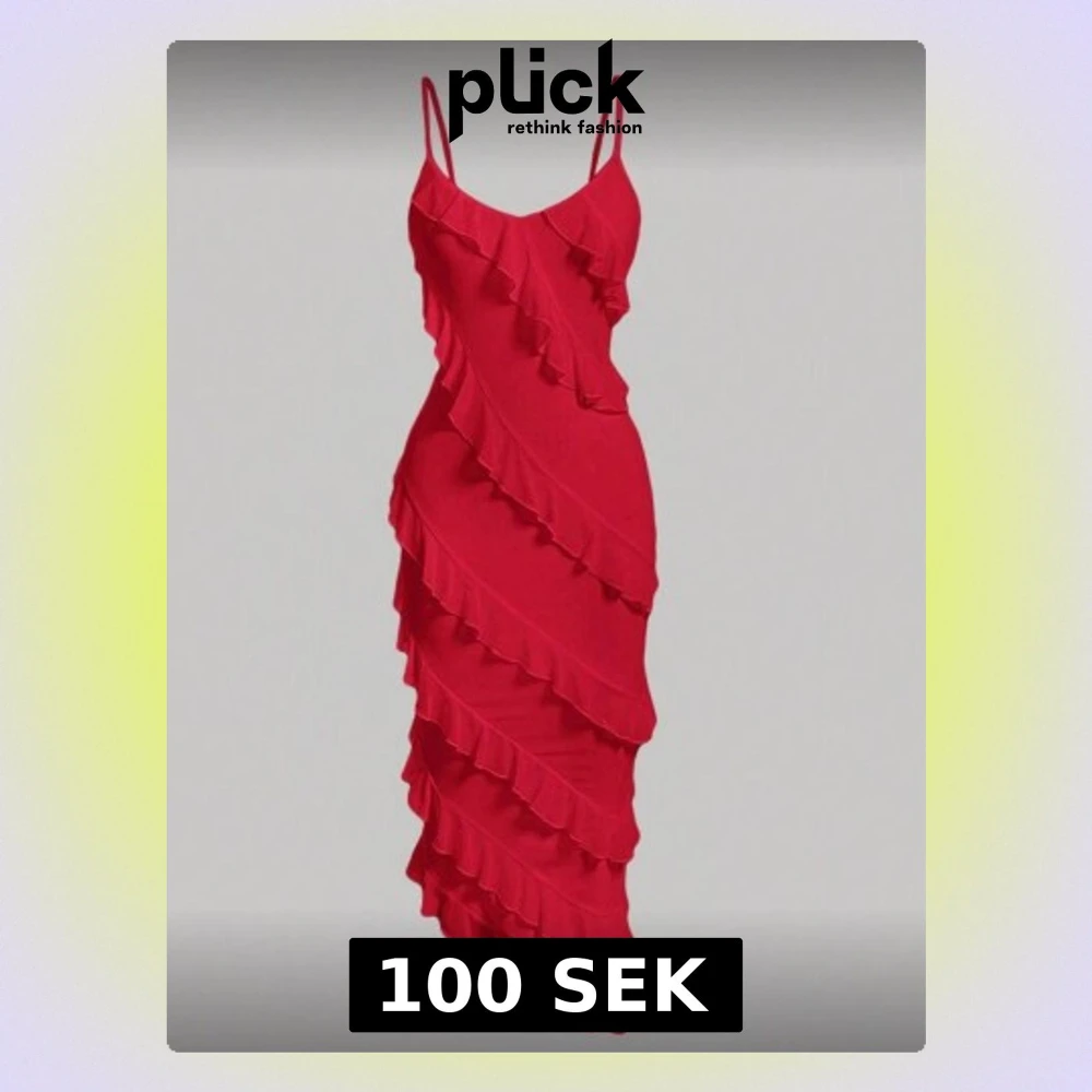 Röd volangklänning med smala axelband - Säljer en röd långklänning med smala axelband och flera diagonala volanger som ger en riktigt snygg och livlig look. Klänningen har asymmetrisk nederkant och är gjord i ett lätt, flödande material som känns skönt mot huden.