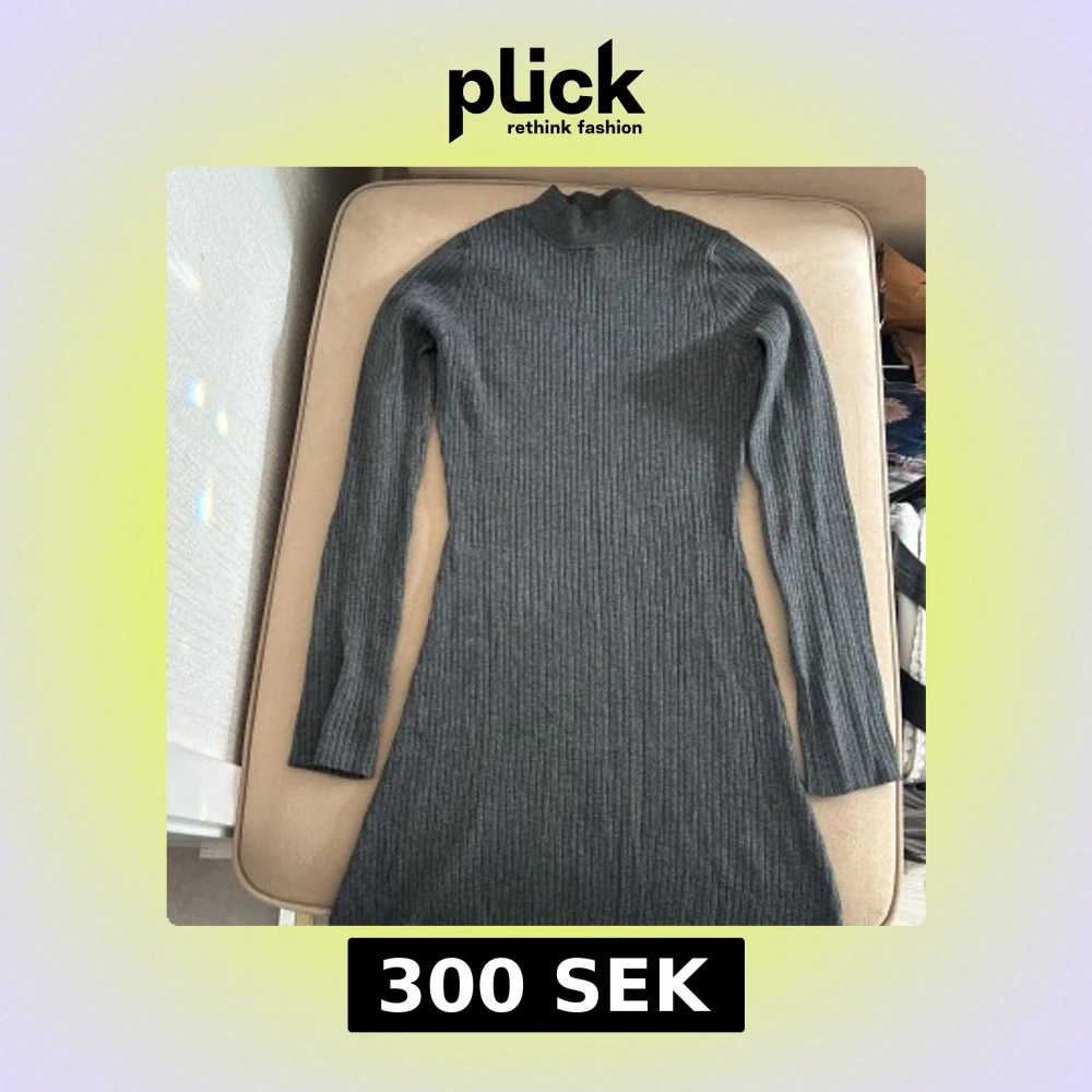 Säljer en stilren grå ribbad klänning med långa ärmar och hög krage. Perfekt för kyligare dagar med sin mjuka och bekväma passform. Klänningen har en slits på sidan som ger en extra touch. Stretchig, passar både Small och Medium.