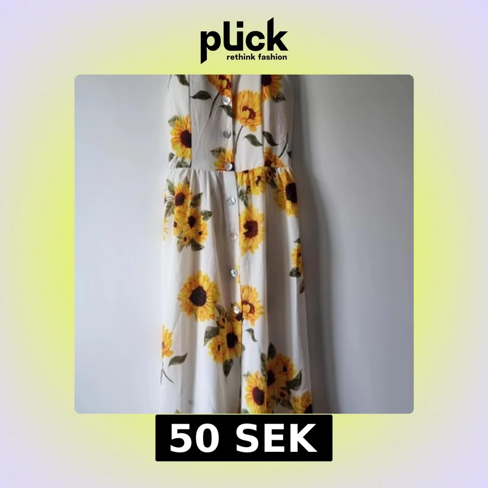 Långklänning med solrosmönster på vit botten. Klänningen har smala axelband, knappar framtill och en luftig, flowy passform. Perfekt för varma dagar när du vill sticka ut med färgglada blommor och somrig vibe.