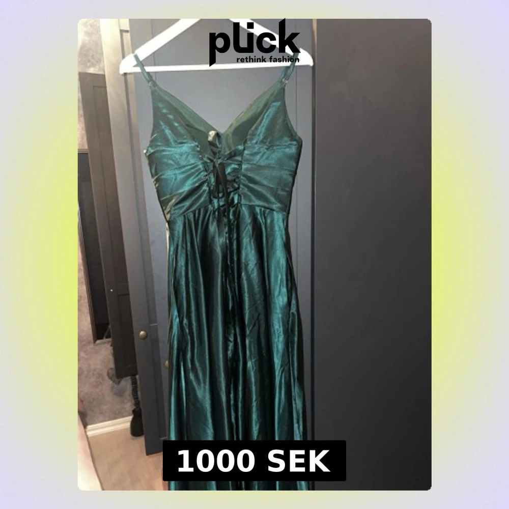 Snygg långklänning i glansigt grönt tyg med smala axelband. Klänningen har snörningsdetalj framtill och ett elegant fall.