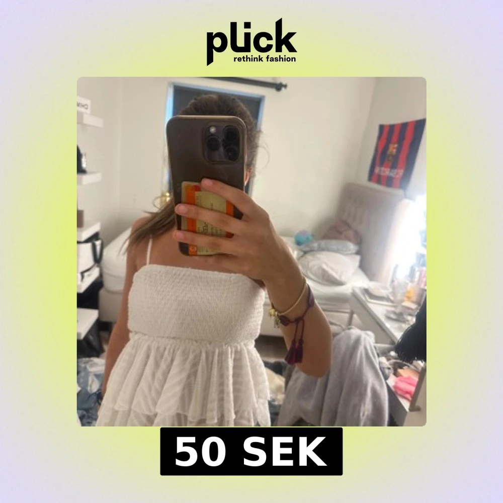 Supersöt vit kortklänning med smockad överdel och tunna axelband. Kjolen har flera lager volanger som ger en luftig och lekfull känsla. Perfekt för varma dagar och har en riktigt fräsch vibe. Materialet känns lätt och bekvämt mot huden.