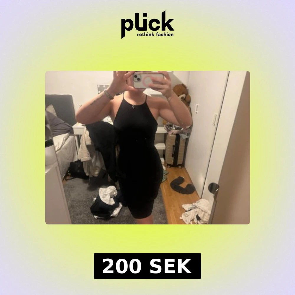 Säljer en svart tight kortklänning med smala axelband som korsas i ryggen och ger en snygg öppen rygg. Klänningen har en enkel och stilren design, perfekt för dig som gillar minimalistiskt mode. Materialet känns mjukt och följsamt mot kroppen.
