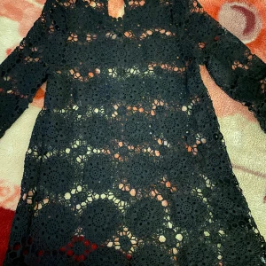 Snygg svart klänning i spets med långärmad design. Perfekt för en elegant look med sitt intrikata mönster och stilrena snitt. Klänningen har en v-ringad hals och en liten öppning bak. Passar utmärkt för speciella tillfällen.