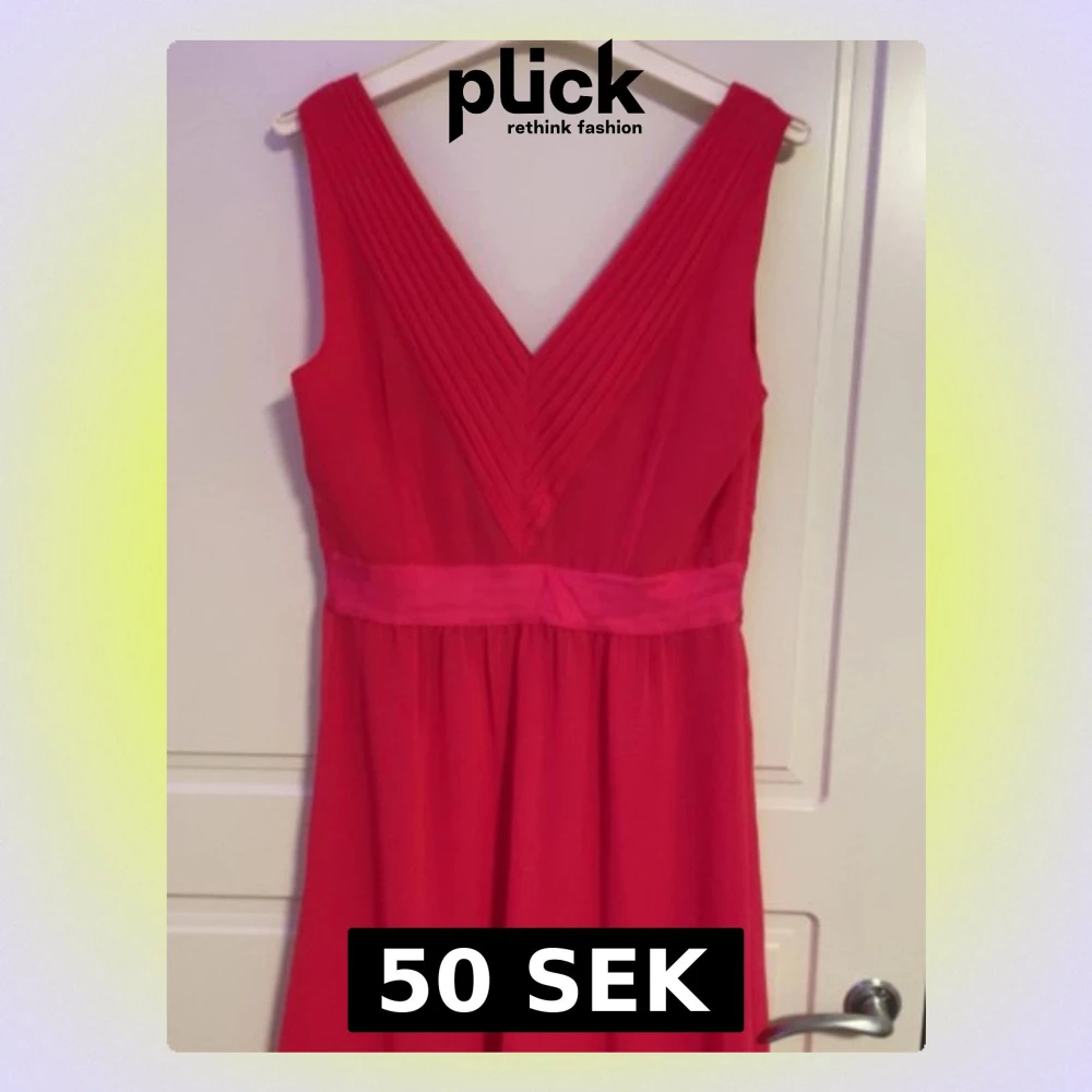 Snygg röd långklänning med markerad midja och djup v-ringning fram och bak. Klänningen är ärmlös och har fina veckade detaljer upptill. Perfekt för dig som vill sticka ut med en färgstark look.