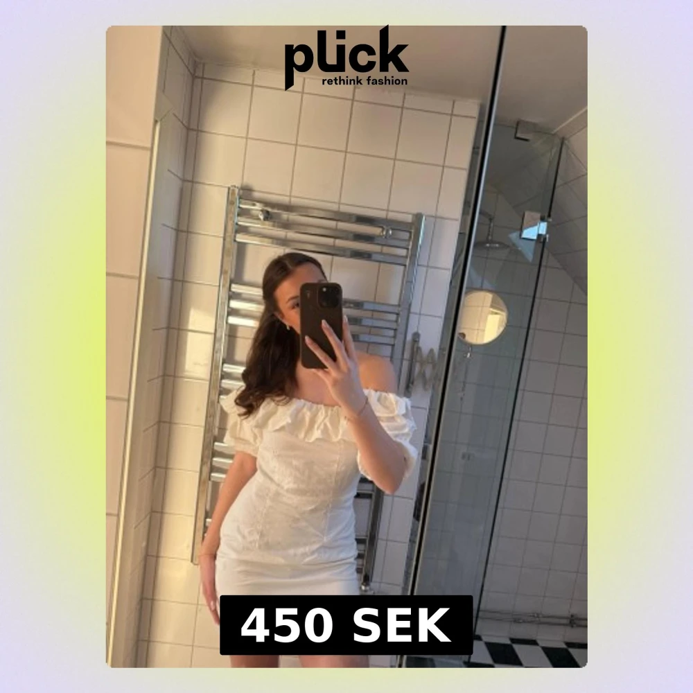 Snygg vit kortklänning med offshoulder och volangdetalj upptill. Klänningen har en figurnära passform och är perfekt för sommarens tillfällen.