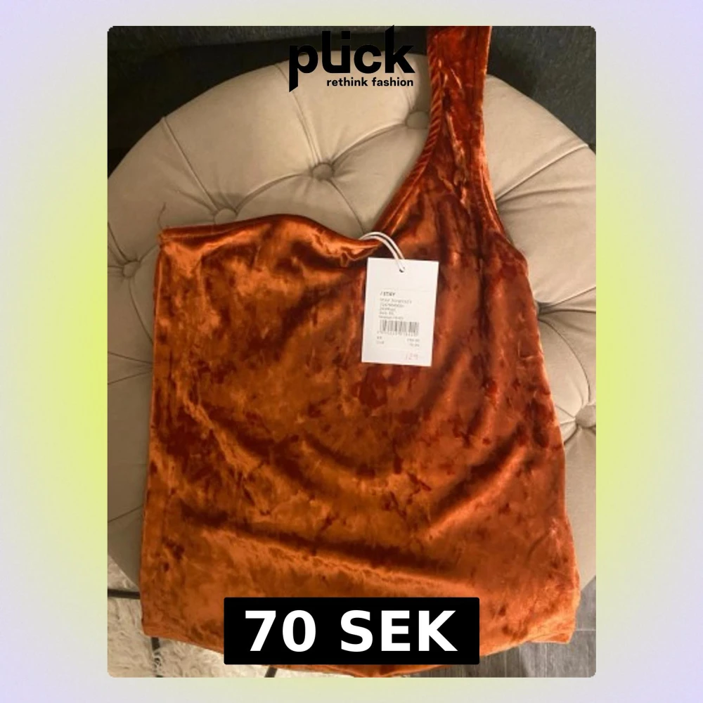 Säljer en snygg rostorange topp i mjuk sammet från Stradivarius. Toppen har en unik oneshoulder-design och är ärmlös, vilket ger en trendig och modern look. Perfekt för dig som vill sticka ut med en cool färg och skön känsla.