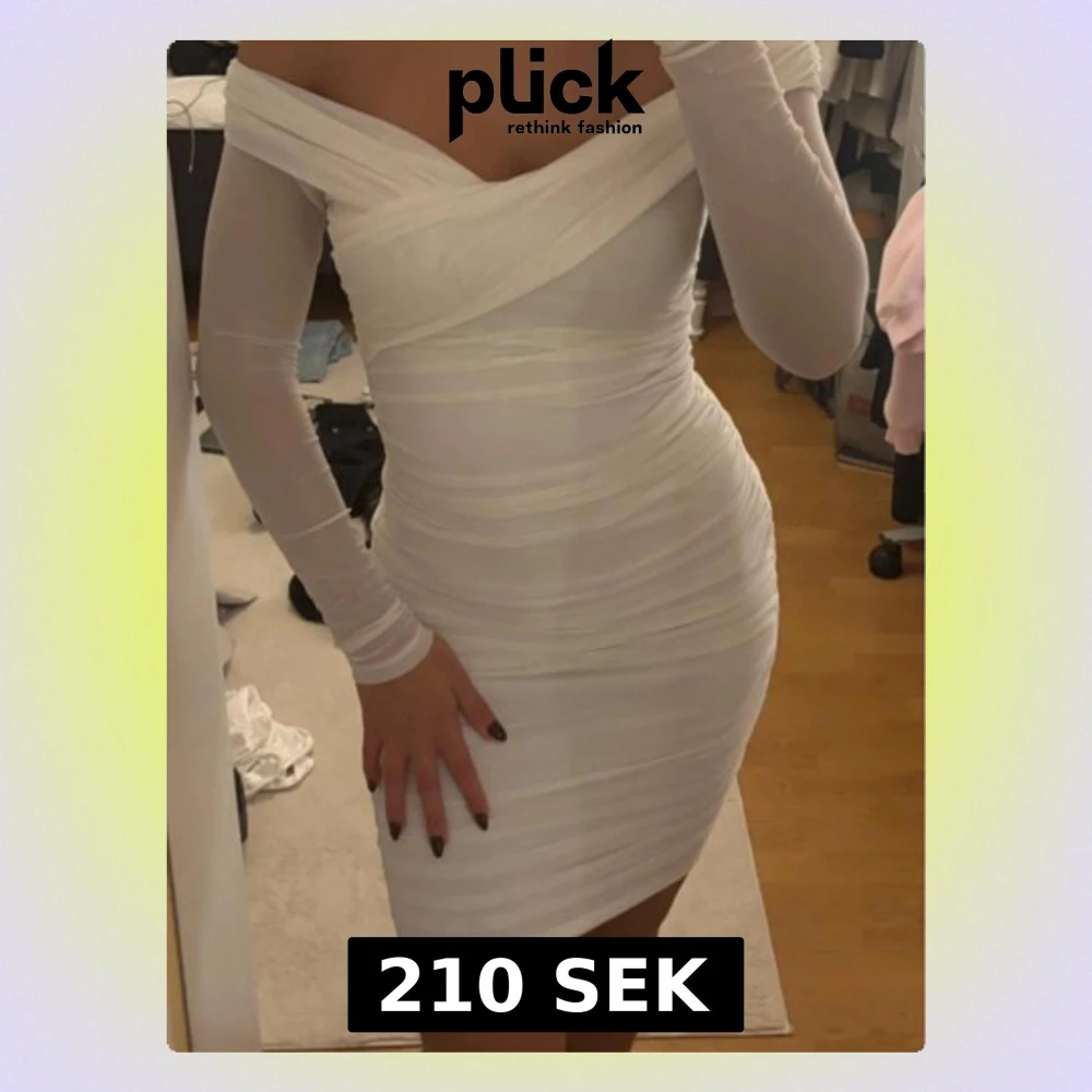 Säljer en vit, figurnära bodycon klänning med off shoulder-design och långa, transparenta ärmar. Klänningen har draperade detaljer och en kort längd som ger en trendig och elegant look. Perfekt för dig som vill sticka ut.