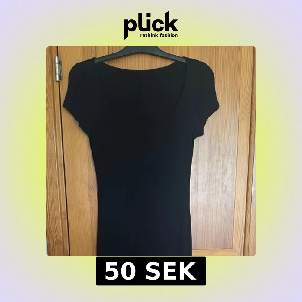 En stilren svart långklänning med rund halsringning och korta ärmar. Klänningen har en enkel och klassisk design som passar perfekt till olika tillfällen. Materialet känns mjukt och följsamt mot kroppen. (Hela fick inte plats på en bild)