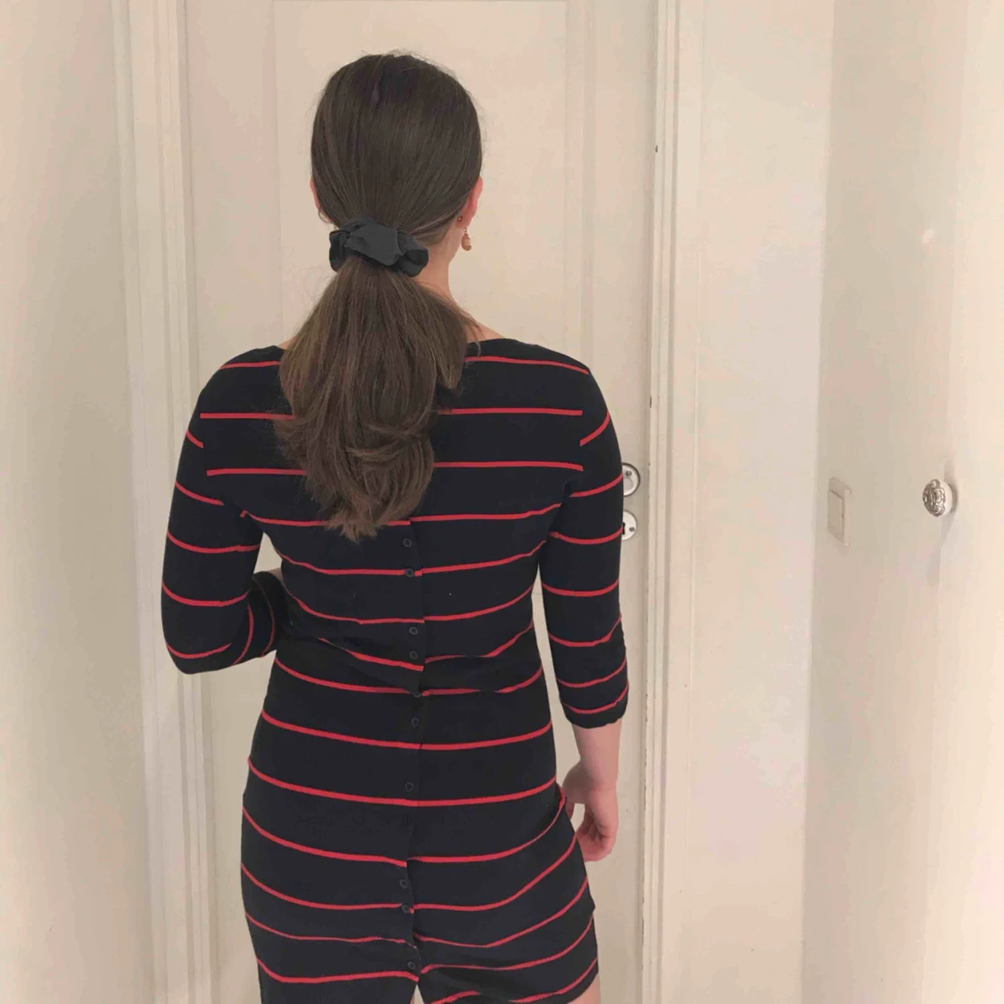 En mörkblå/ röd randig klänning från Svea med knäppningar på baksidan
