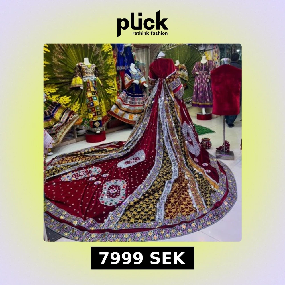 Superunik vinröd långklänning med maxad släp, broderier i guld, silver och vitt samt färgglada detaljer. Klänningen har puffiga ärmar, bred kjol och är dekorerad med speglar, pärlor och mönster. Perfekt för dig som vill sticka ut på bal eller fest. Generellt är det afghansk kultur kläder. Jag är 162 och väger 48 kg och är lite sto, generellt skulle det passa många eftersom det är en stor lång klänning