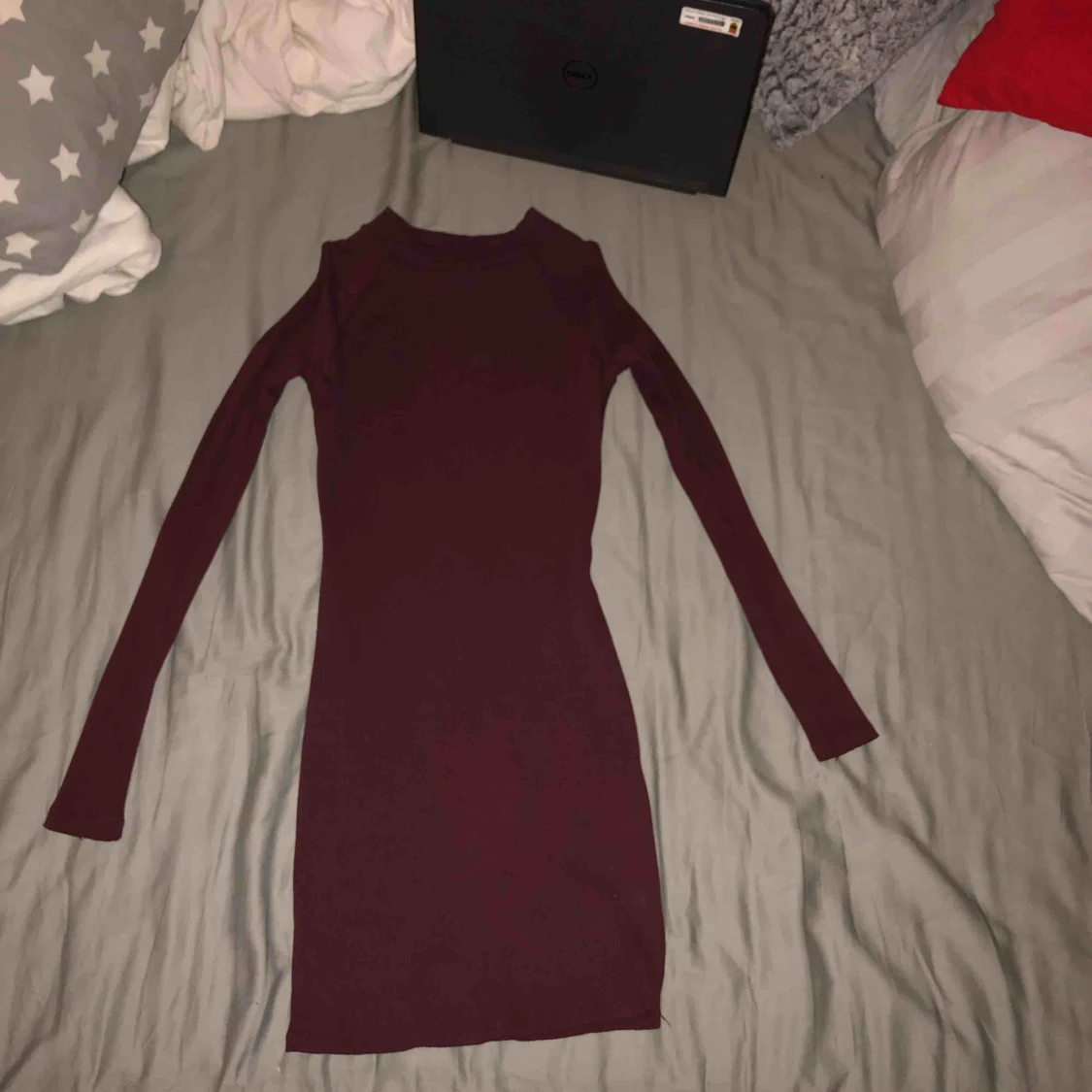 kort ribbad klänning. visar axlar. vinröd