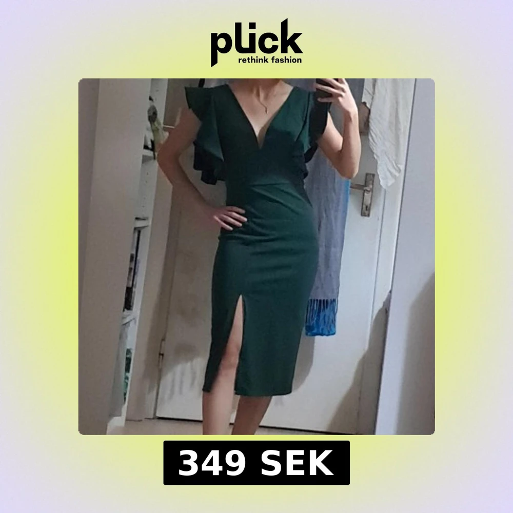 Supersnygg mörkgrön klänning från WalG med v-ringning, volangärmar och slits framtill. Klänningen är figurnära och har en elegant midilängd. Perfekt för dig som vill sticka ut med stilrena detaljer och en djup rygg. Materialet känns mjukt och följsamt. Storlek xs