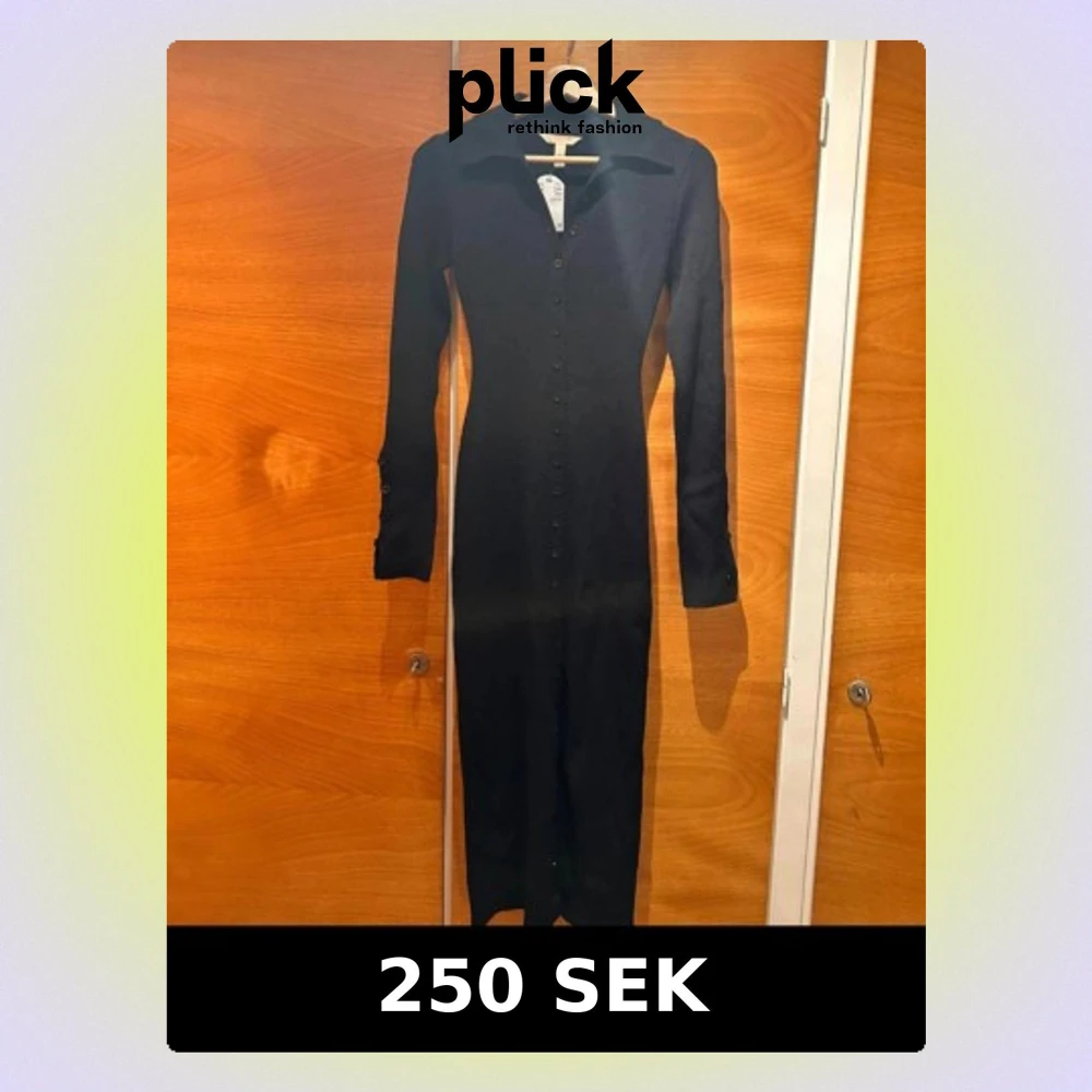 Stilren svart långklänning med lång ärm och knappar hela vägen framtill. Klänningen har en klassisk krage och figurnära passform som ger en snygg siluett. Perfekt för dig som gillar minimalistisk och tidlös stil.