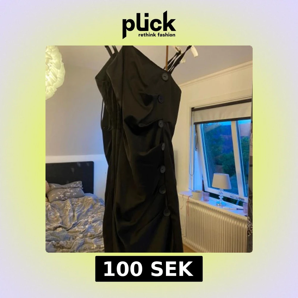 Svart kort klänning från SisterS Point med smala axelband och stora dekorativa knappar framtill. Snygg drapering längs sidan och figurnära passform. Perfekt för dig som gillar stilrena och trendiga plagg.