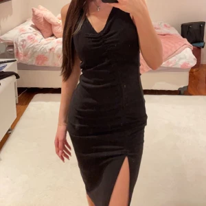 Jag säljer en svart tight klänning med slits framme. Klänningen har använts en gång tidigare och passar perfekt till fester.