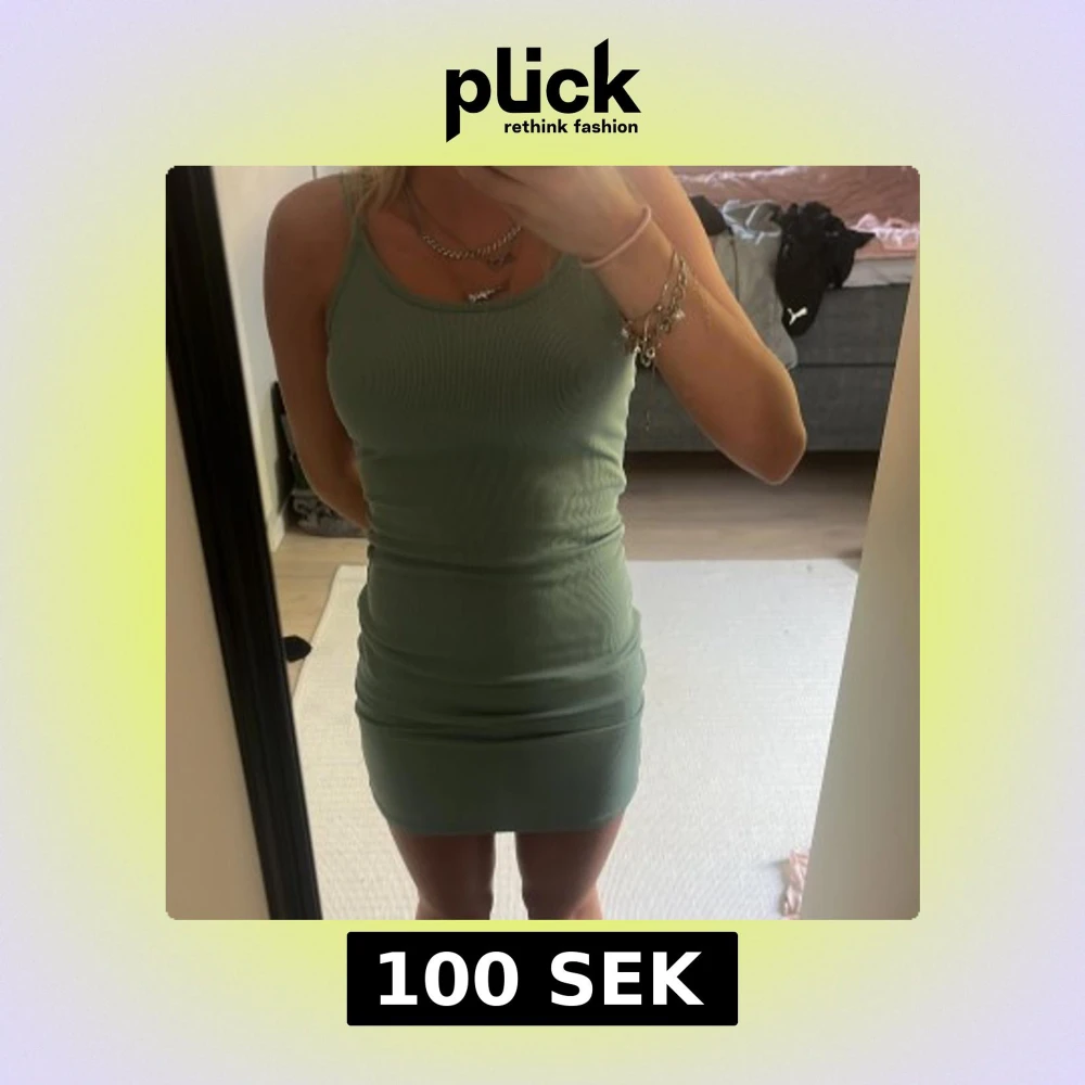 Säljer en tight, ribbad grön klänning som är köpt i spanien med smala axelband och rund halsringning. Klänningen är kort och har en enkel, stilren design som passar perfekt till sommaren. det är inbyggd bh💕💕