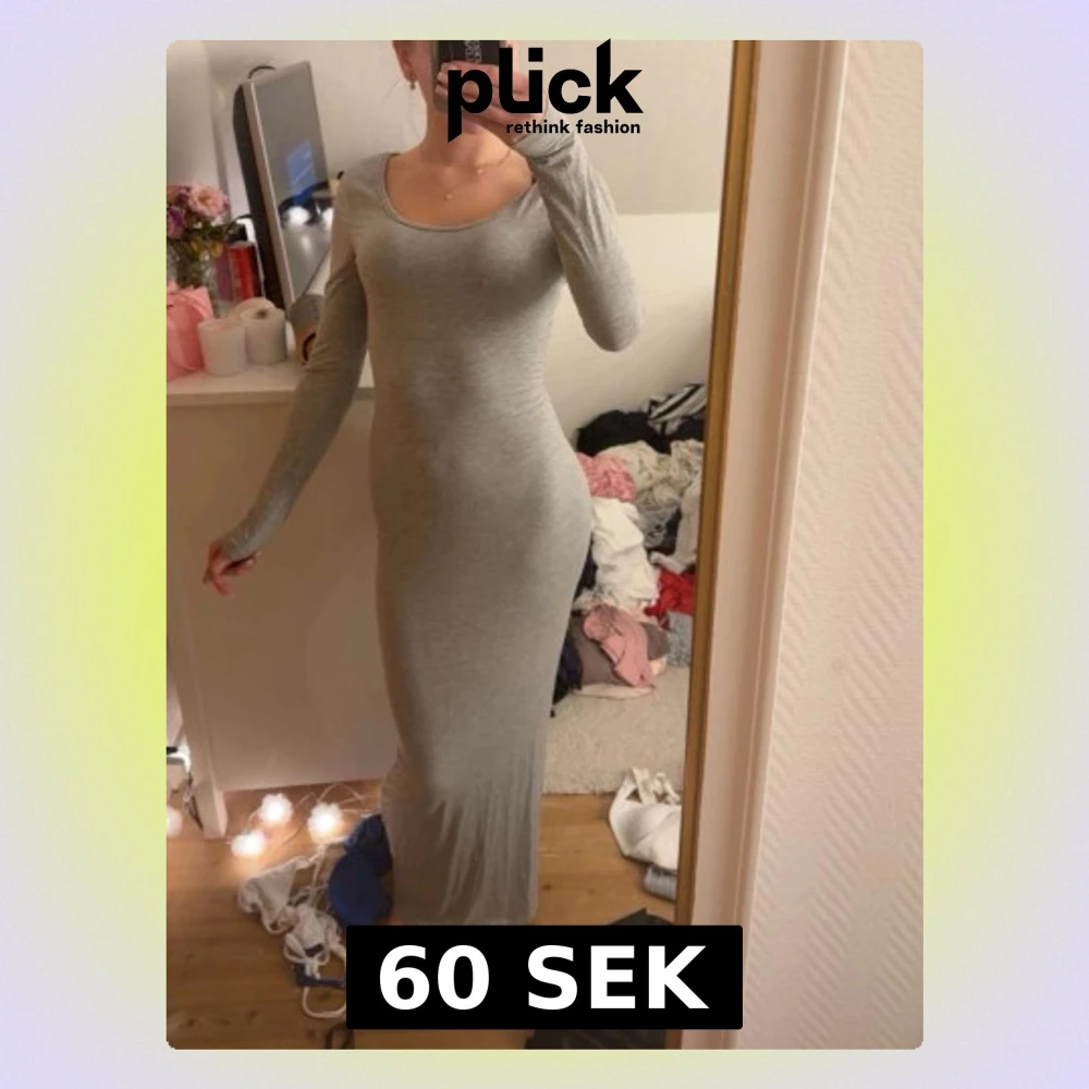 Säljer en enkel och stilren ljusgrå långklänning med lång ärm och rundad halsringning. Klänningen har en tight passform och är tillverkad i ett mjukt stretchigt material som sitter snyggt på kroppen.